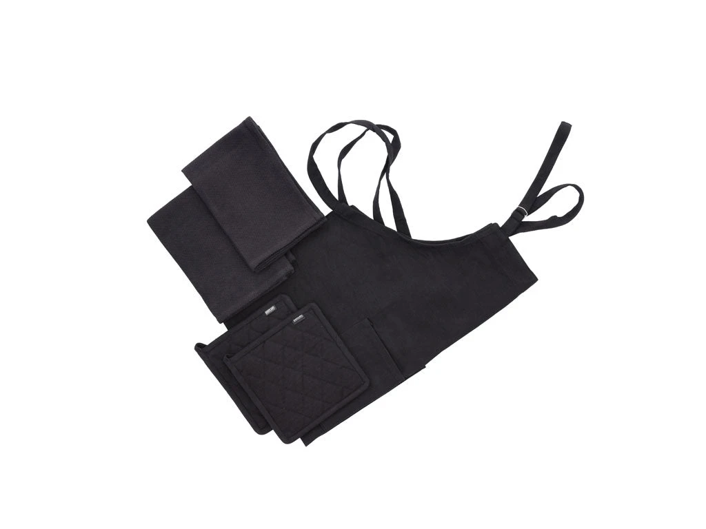 Sættet består af 2 viskestykker, 2 grydelapper og forklæde.Fremstillet i 100% ny Oeko-Tex bomuld