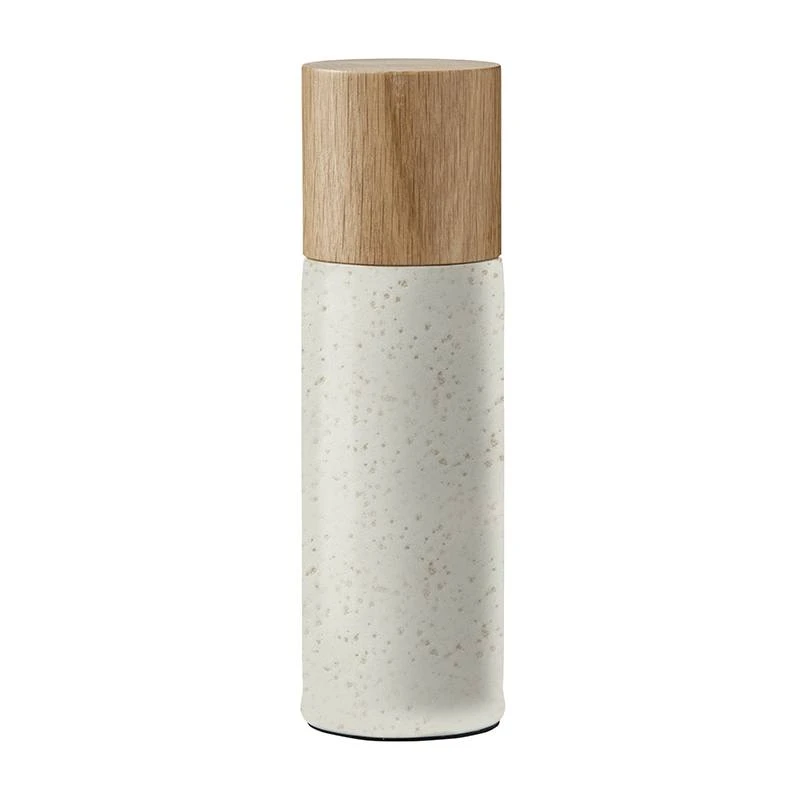 Kværnen er i matglaseret stentøj med top i egetræ. Kværnen har keramisk kværnværk med 5 års garanti. Flot reaktiv glasur der fremhæver stentøjets glød Højde 16,7 cm Diameter 5 cm