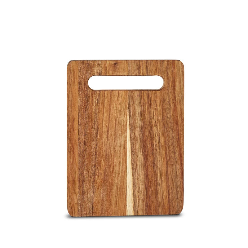 Rektangulært skærebræt i akacietræ med indvendigt udskåret håndtag.