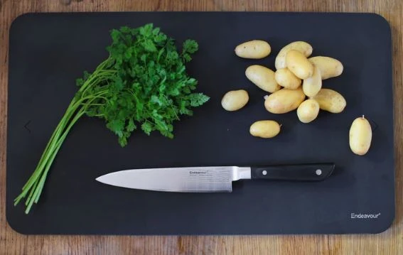 Et skærebræt der er skabt ud fra tanken om, at det skal kunne holde til hverdagens hårde slid. Skærebrættet er slidstærkt og taler selv de skarpeste knive. Der er bløde knopper på undersiden som sørger for, at skærebrættet står godt fast på køkkenbordet under brug. Derud over er skærebrættet varmefast op til 170 grader og tager derfor ikke skade af, at du stiller en varm gryde på overfladen. Desuden tåler det at komme en tur i opvaskemaskinen.