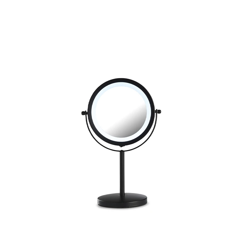Spejl i mat sort med 17 LED lys. Almindeligt spejl på den ene side og 5 gange forstørrelse på den anden side.Kan rotere 360 grader.Bruger 4 x AAA Batterier (medfølger ikke)