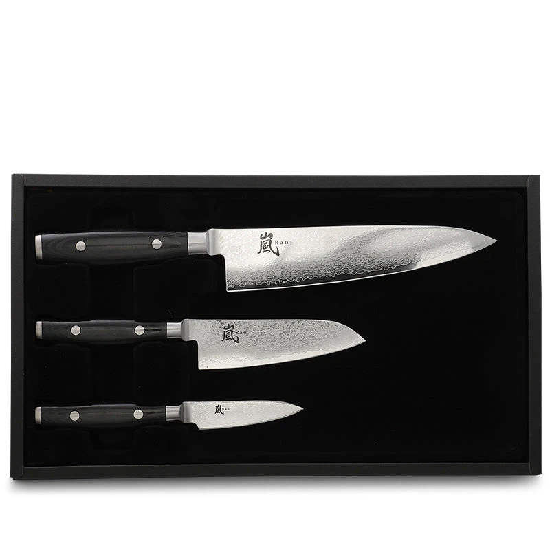Yaxell Ran gavesæt/ knivsæt bestående af 3 knive:Urtekniv 8 cmSantokukniv 12,5 cmKokkekniv 20 cmYaxell mestrer at smede knive i flerlags-stål. En smedemetode, der giver knivene de optimale egenskaber, som kræves af professionelt køkkenværktøj i dag. Fremstillingen giver både øget styrke, skarphed og nærmest uendelig holdbarhed hvis kniven plejes. Kniven er kendetegnet ved det karakteristiske Damaskus-mønster. Håndtaget er udviklet af et særligt materiale der giver god hygiejne samt optimal styrke. Materialet er en blanding af hør og harpiks, hvilket sikrer mod åbninger mellem håndtag og stål.RAN knivene består af 69 lag stål med en kerne af det særlige japanske VG10 knivstål, der omsluttes på hver side af 34 lag af skiftevis blødt og hårdt rustfrit stål. RAN serien har en hårdhed på hele 61 på Rockwell-skalaen.